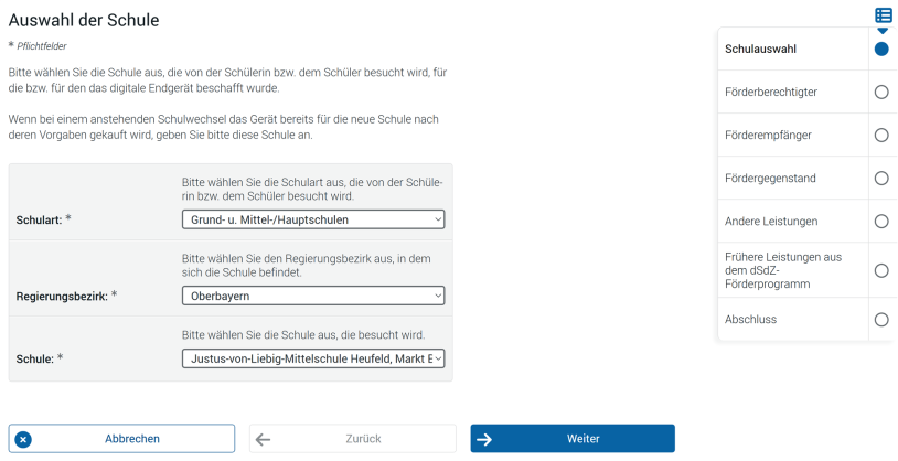 Beachten Sie bitte, dass Sie auf der ersten Antragsseite bei der Auswahl der Schule nicht die im Video gezeigten Daten verwenden, sondern die Daten aus dem Bild auf dieser Webseite .